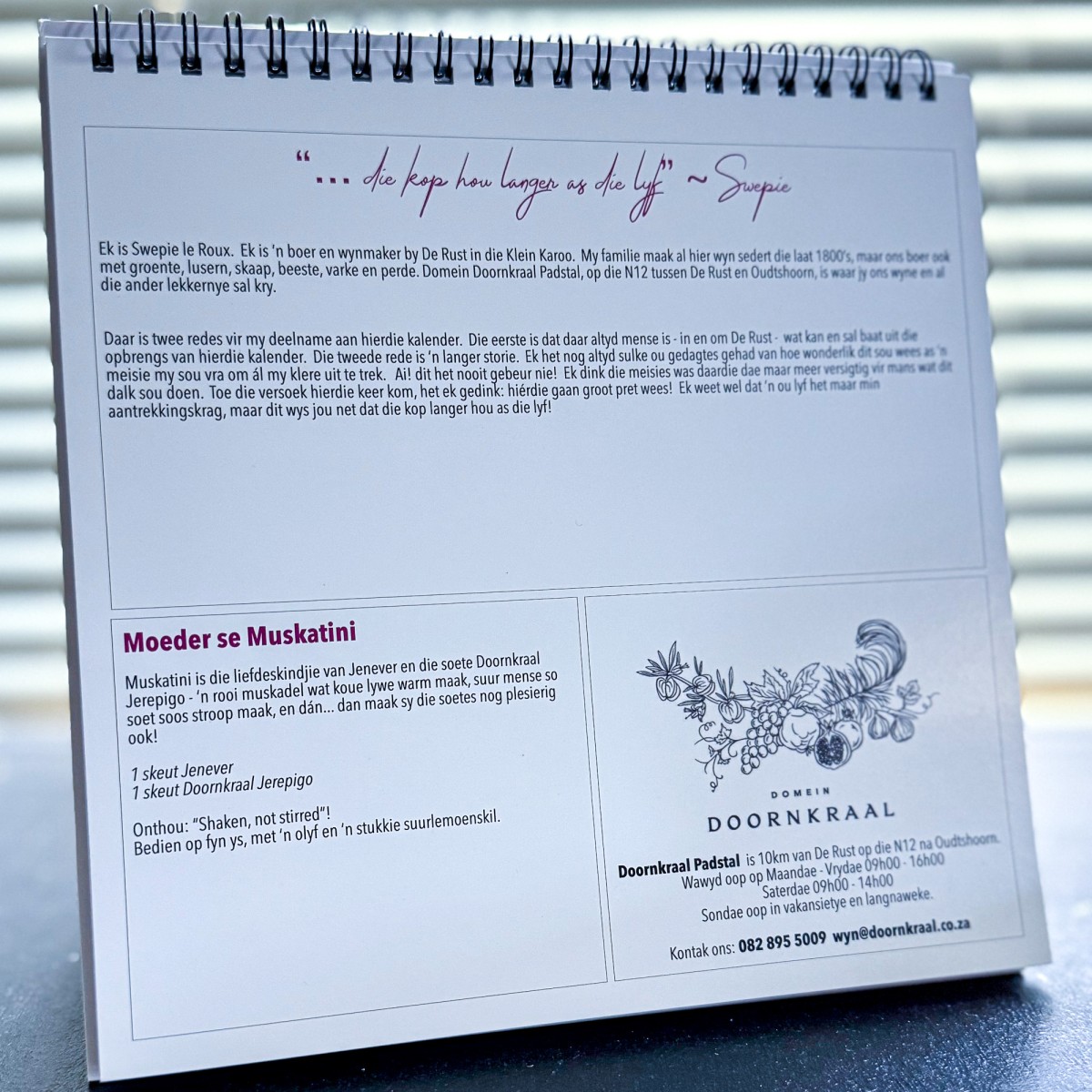 In jou hand hou jy ‘n kalender van Julie 2024 – Junie 2025, dertien wonderlike Karoo skemerkelkie resepte en dertien (ja, daar is n bonus foto) oorspronklike fotos, wat jou sal vermaak en hopelik effens sal laat bloos.